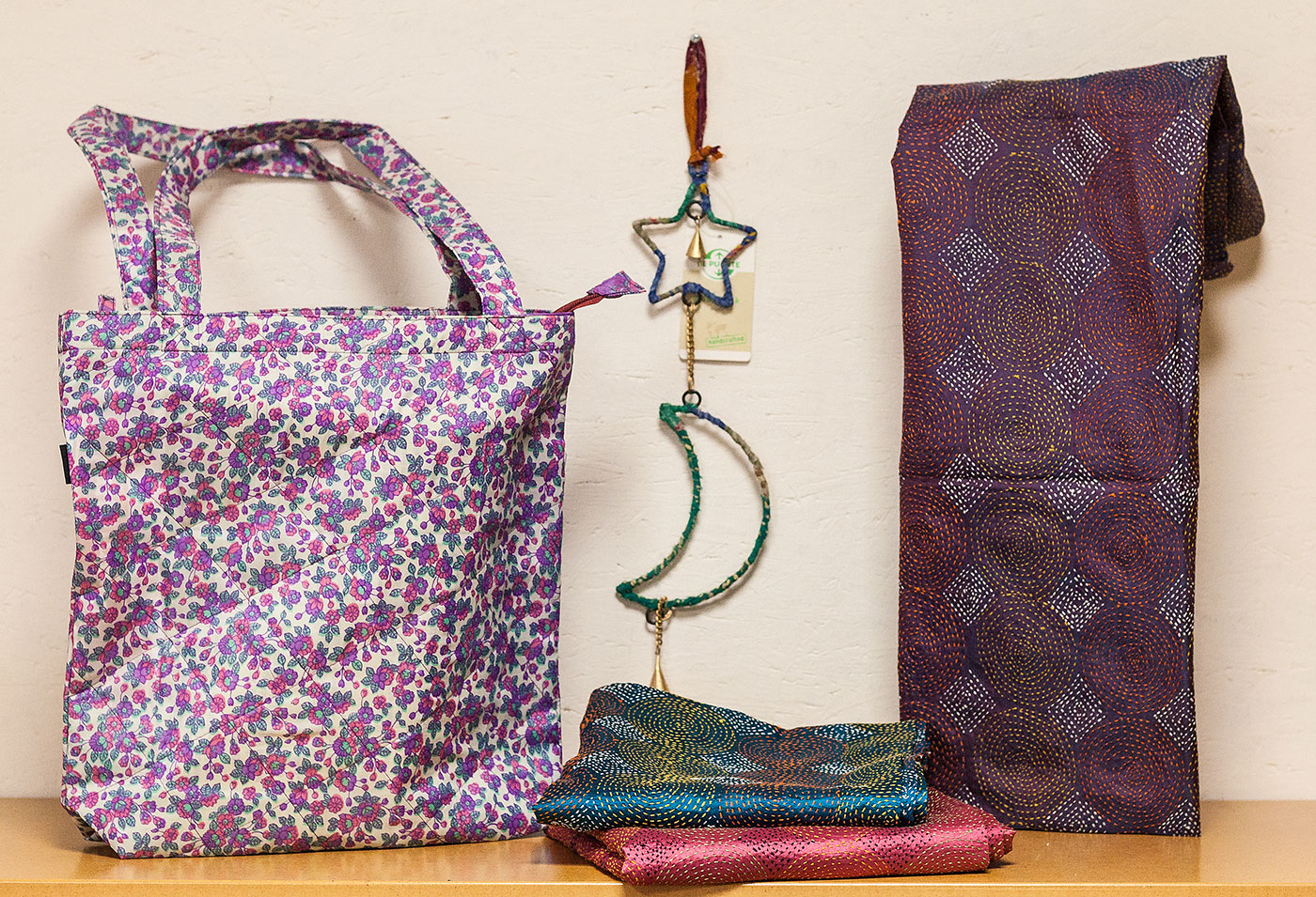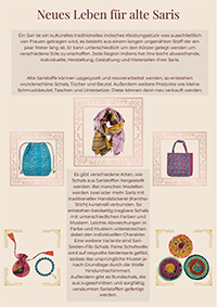Ein Sari ist ein kulturelles traditionelles indisches Kleidungsstück was ausschließlich von Frauen getragen wird, es besteht aus einem langen ungenähten Stoff der ein paar Meter lang ist. Alte Saristoffe können upgecycelt und neuverarbeitet werden, so entstehen wunderschöne Schals, Tücher und Beutel. Außerdem weitere Produkte wie kleine Schmuckbeutel, Taschen und Untersetzer.